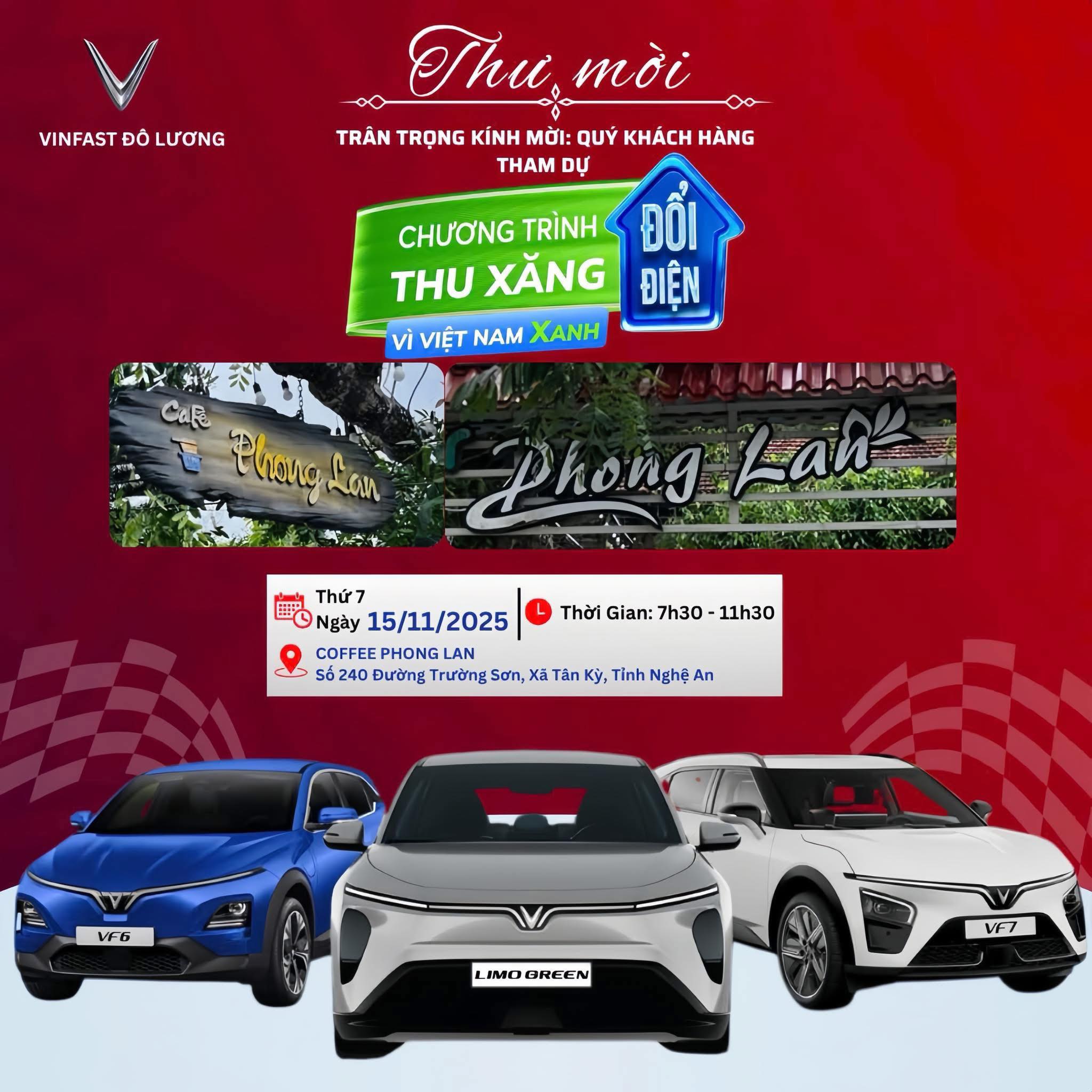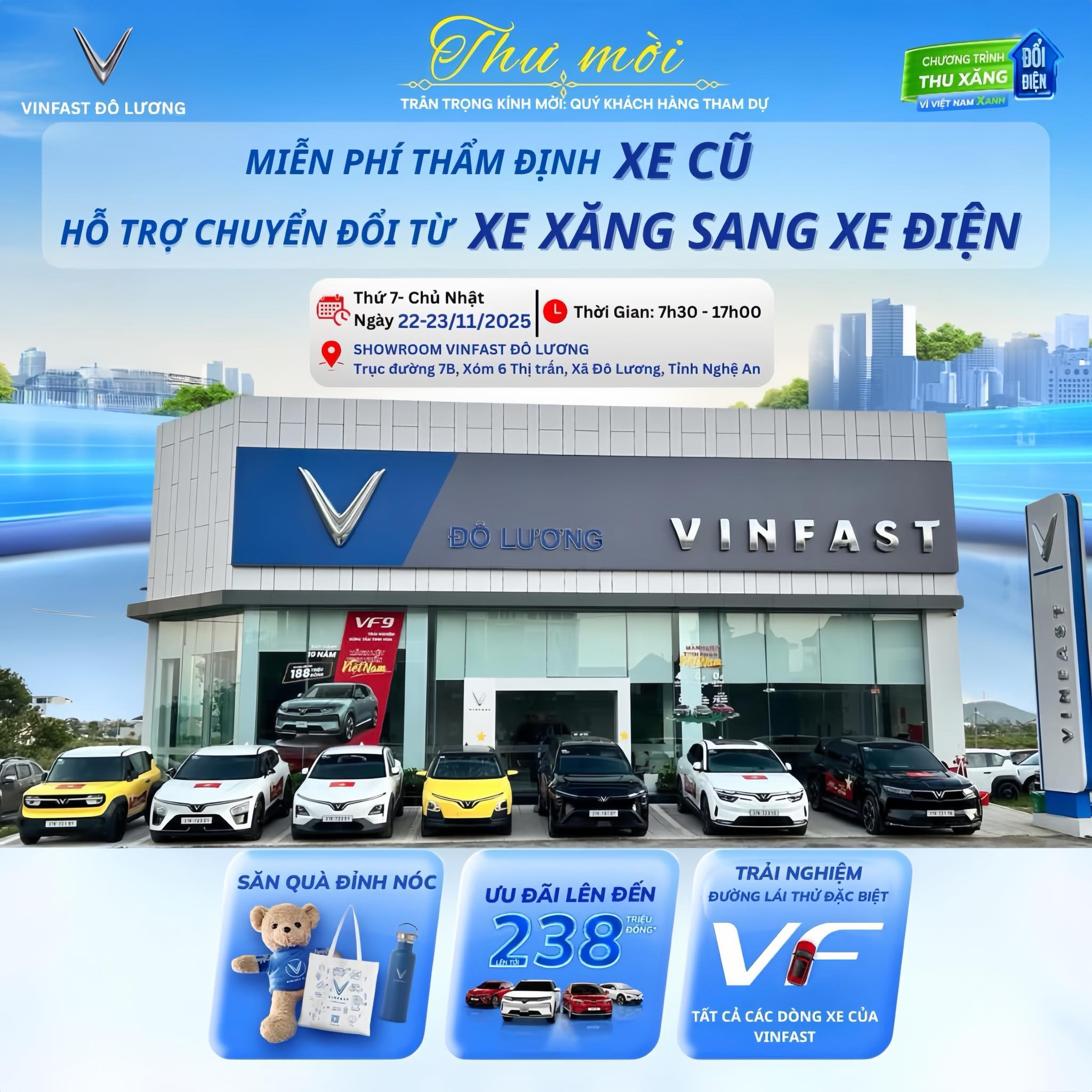 Thời gian: 7h30 – 17h00, Thứ Bảy – Chủ Nhật ngày 22-23/11/2025 Địa điểm: Showroom VinFast Đô Lương, Trục Đường 7B,...